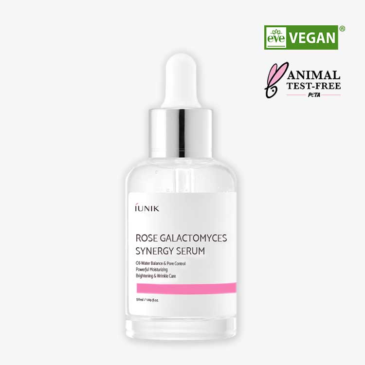 The iUNIK Rose Galactomyces Synergy Serum is a highly moisturising serum that balances, controls excessive sebum, targets enlarged pores, and brightens the skin. Made with 50% of the galactomyces ferment filtrate to lift and control the skin's oil content, and 10% of rosewater to moisturise and balance the skin.